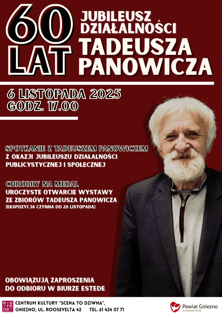 Z ogromną przyjemnością zapraszamy na okrągły jubileusz 60-lecia działalności publicystycznej i społecznej Tadeusza Panowicza. Wydarzenie odbędzie się 6 listopada o godz. 17.00 w Centrum Kultury „Scena to dziwna”. Oprócz spotkania z Tadeuszem Panowiczem nie zabraknie krótkich występów artystycznych oraz otwarcia wystawy „Chrobry na medal”, w ramach której zostaną zaprezentowane pamiątki ze zbiorów jubilata o tematyce początków polskiej państwowości. Bezpłatne zaproszenia na wydarzenie do odbioru w biurze CK eSTeDe.