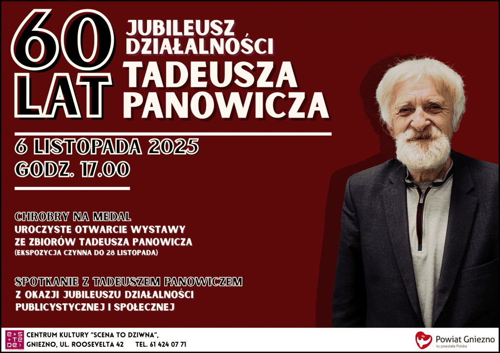 Z ogromną przyjemnością zapraszamy na okrągły jubileusz 60-lecia działalności publicystycznej i społecznej Tadeusza Panowicza. Wydarzenie odbędzie się 6 listopada o godz. 17.00 w Centrum Kultury „Scena to dziwna”. Oprócz spotkania z Tadeuszem Panowiczem nie zabraknie krótkich występów artystycznych oraz otwarcia wystawy „Chrobry na medal”, w ramach której zostaną zaprezentowane pamiątki ze zbiorów jubilata o tematyce początków polskiej państwowości. Bezpłatne zaproszenia na wydarzenie do odbioru w biurze CK eSTeDe.