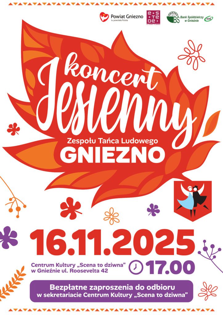 Zapraszamy na wyjątkowy, jesienny koncert w wykonaniu Zespołu Tańca Ludowego „Gniezno”! W trakcie trwania koncertu zespół zaprezentuje znane i lubiane utwory oraz widowiskowe układy taneczne – bezpłatne zaproszenia do odbioru w biurze CK eSTeDe.