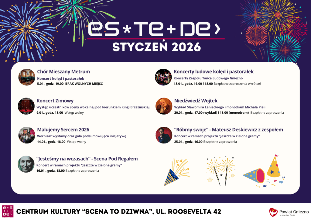 Dzieje się w eSTeDe! Na nowy rok mamy dla Was naprawdę dużo wydarzeń – przede wszystkim muzycznych! Posłuchajcie z nami kolęd, piosenek Wojciecha Młynarskiego, zobaczcie wyjątkowe obrazy i poznajcie historię niedźwiedzia Wojtka!