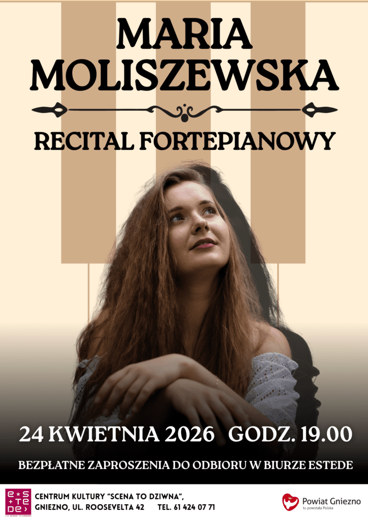 Centrum Kultury „Scena to dziwna” zaprasza na wyjątkowy recital fortepianowy! 24 kwietnia o godz. 19.00 wystąpi w Gnieźnie utalentowana Maria Moliszewska. Bezpłatne zaproszenia można odbierać w biurze CK eSTeDe.