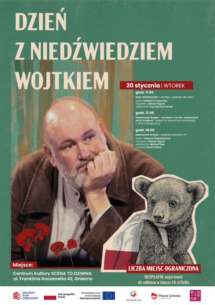 Kochani, tym razem smutna wiadomość – z przyczyn od nas niezależnych musimy odwołać najbliższe popołudniowe wydarzenia 20 stycznia, związane z niedźwiedziem Wojtkiem. Monodram Michała Pieli i wykład Sławomira Łanieckiego odbędą się w innym terminie, który podamy wkrótce. Na wydarzenie będą obowiązywać nowe zaproszenia! poranny spektakl dla dzieci pozostaje bez zmian.